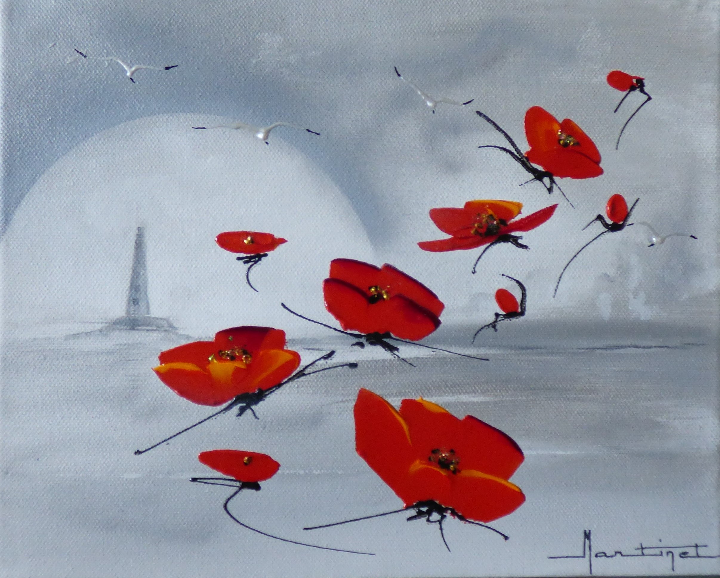 Yves Martinet : « Paysages régionaux sublimés par des coquelicots flamboyants. Les fonds sont peints au couteau de peintre ou au pinceau et les coquelicots au couteau pour leur donner présence et relief. »