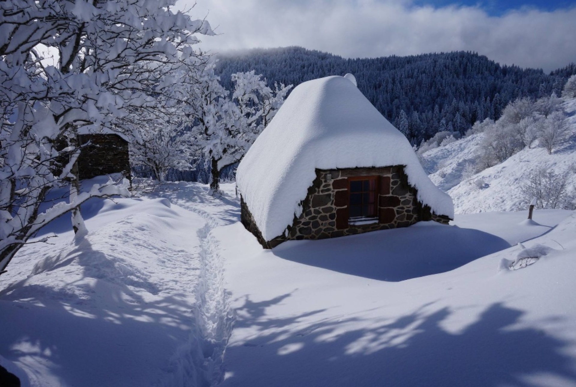Charmante maisonnette en pierres, bois et chaume. Blottie sur les pentes sud du Mont Mézenc, près du Mont Gerbier de Jonc. A 8 minutes du domaine skiable des Estables. Situation exceptionnelle !