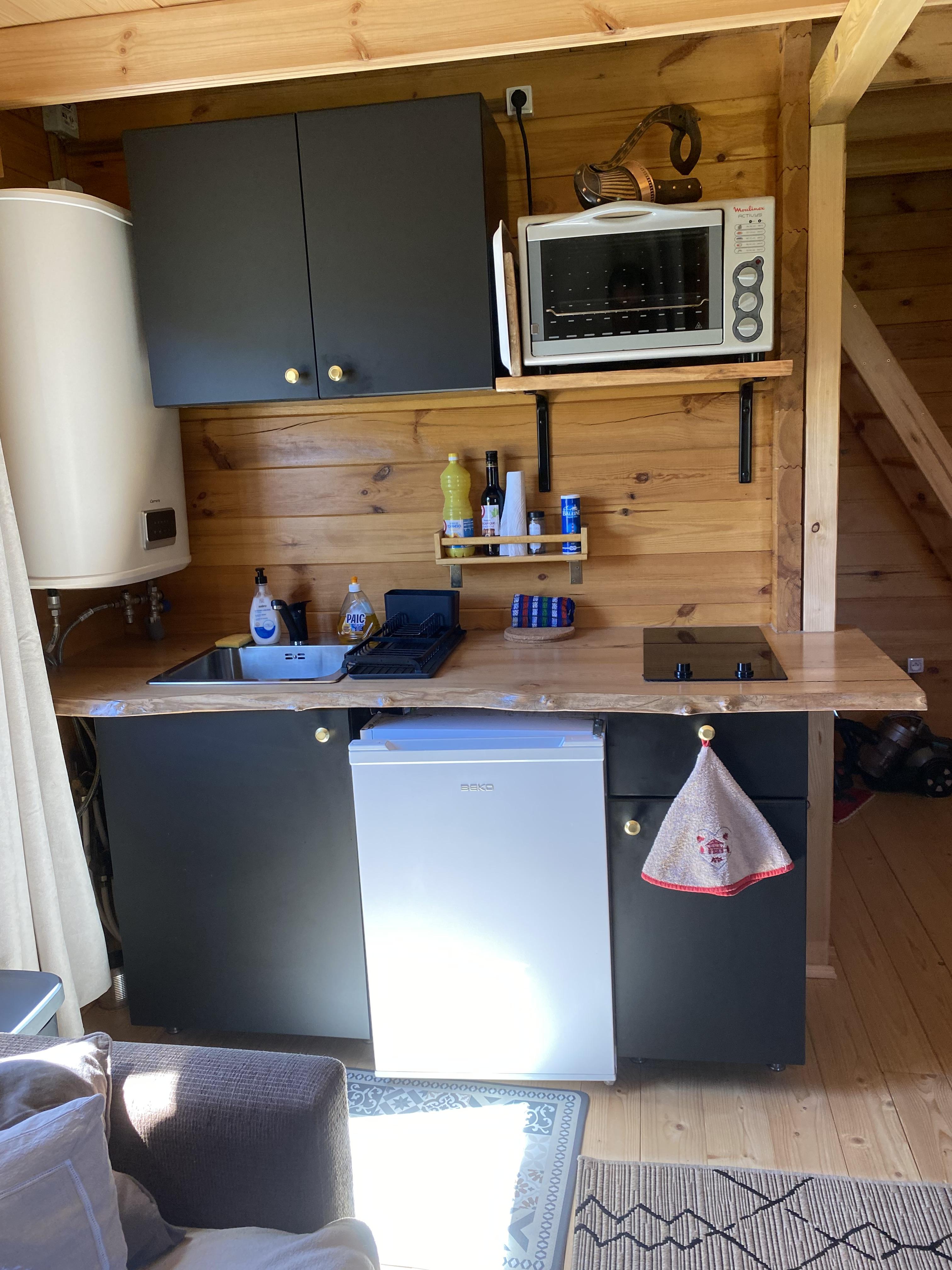 Cuisine équipée, Frigo, Plaque induction, Four, Micro-ondes.