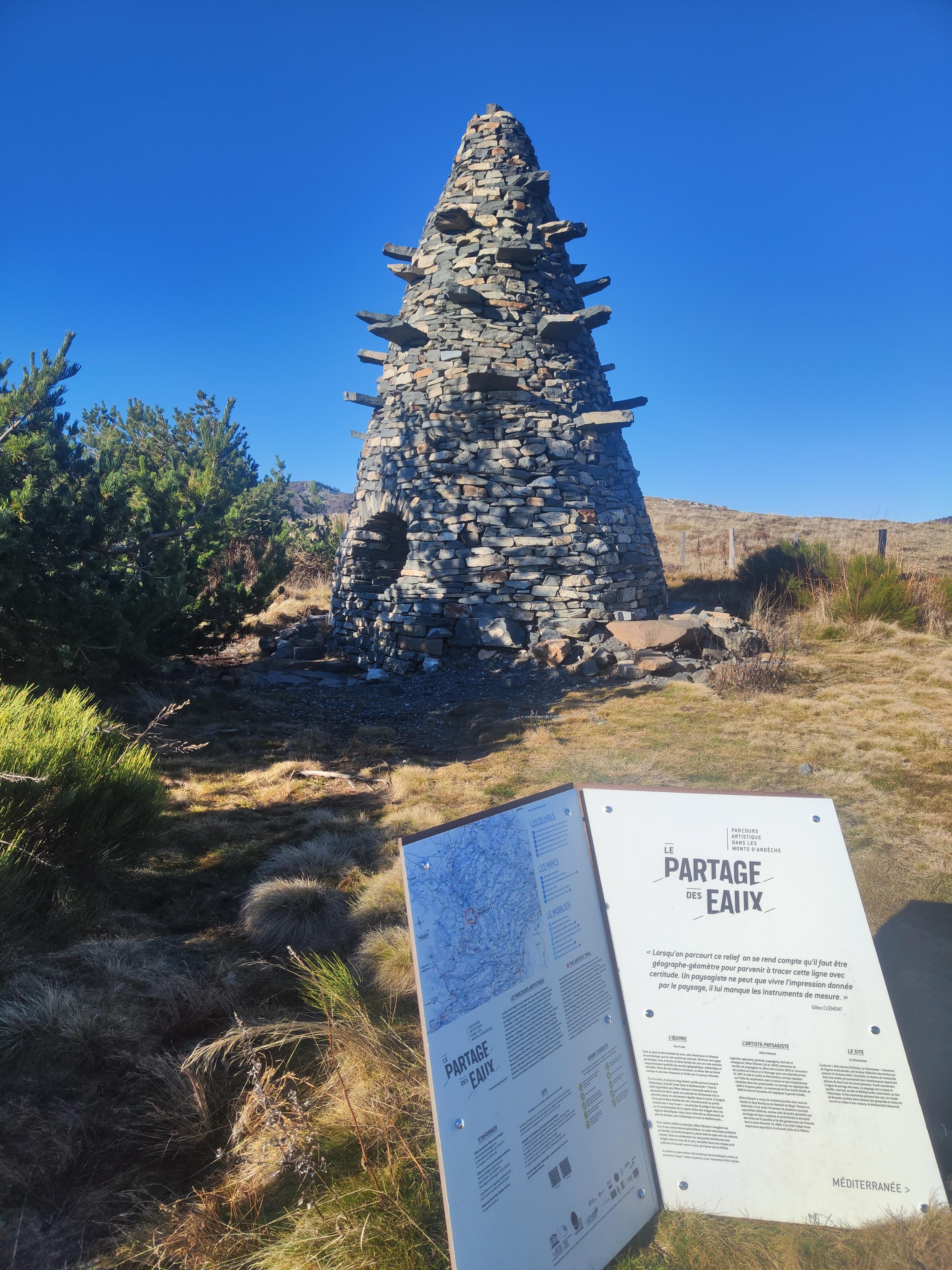 Pour rendre visible ce principe, Gilles Clément a imaginé une Tour à eau construite en phonolithes, la roche volcanique présente au Gerbier. Sa forme évoque un phare dont le cœur est une colonne creuse. L’eau se condensant sur ses parois extérieures est dirigée vers le creux de la Tour, recueillie dans une vasque puis orientée d’une part vers la Loire, de l’autre vers le Rhône.