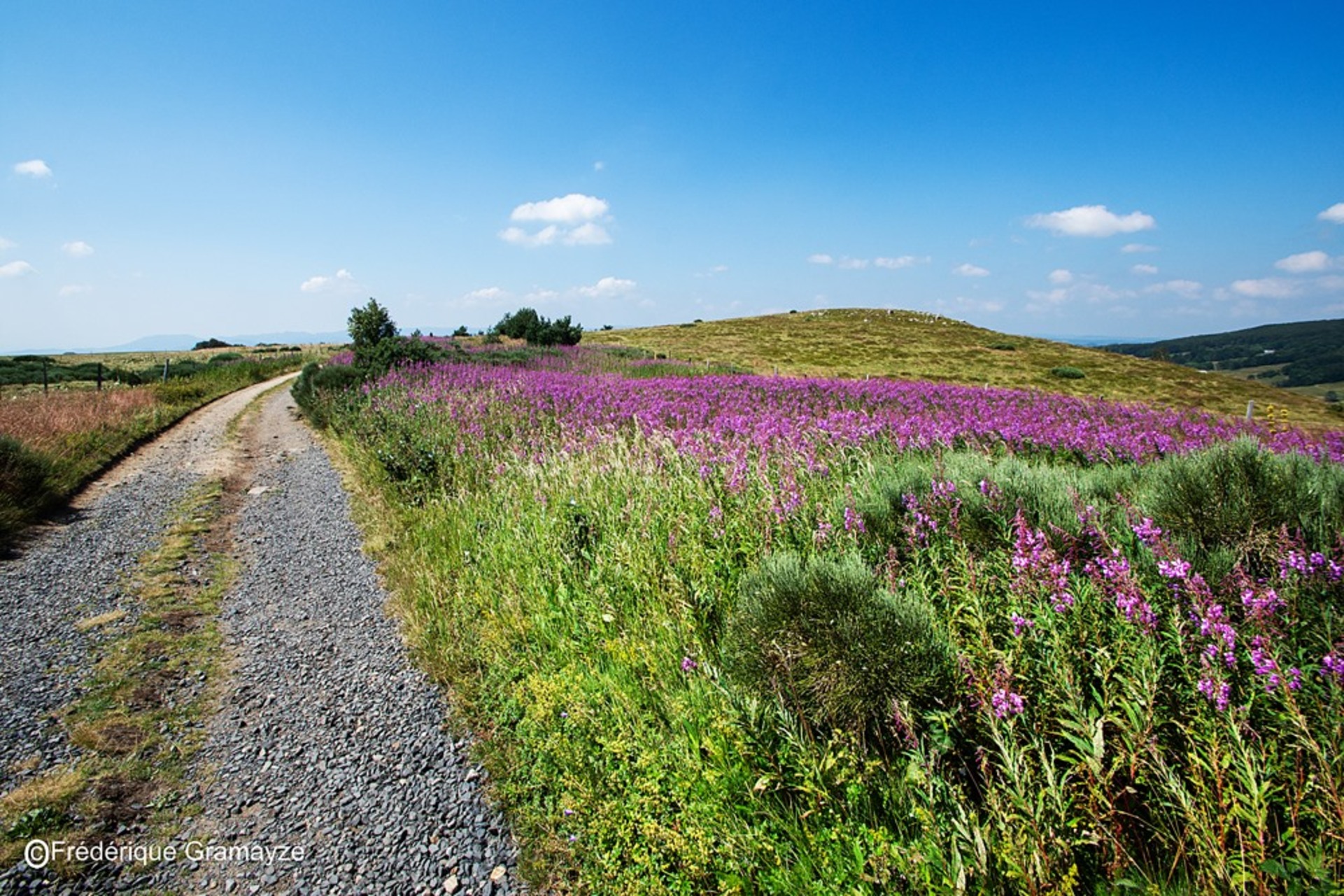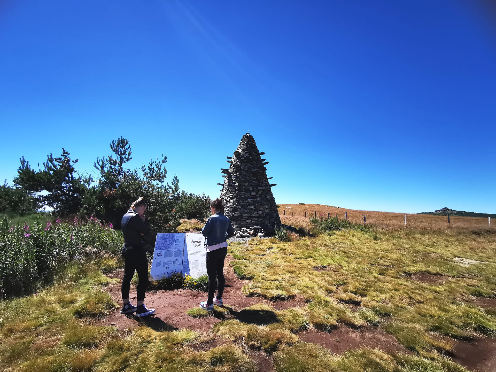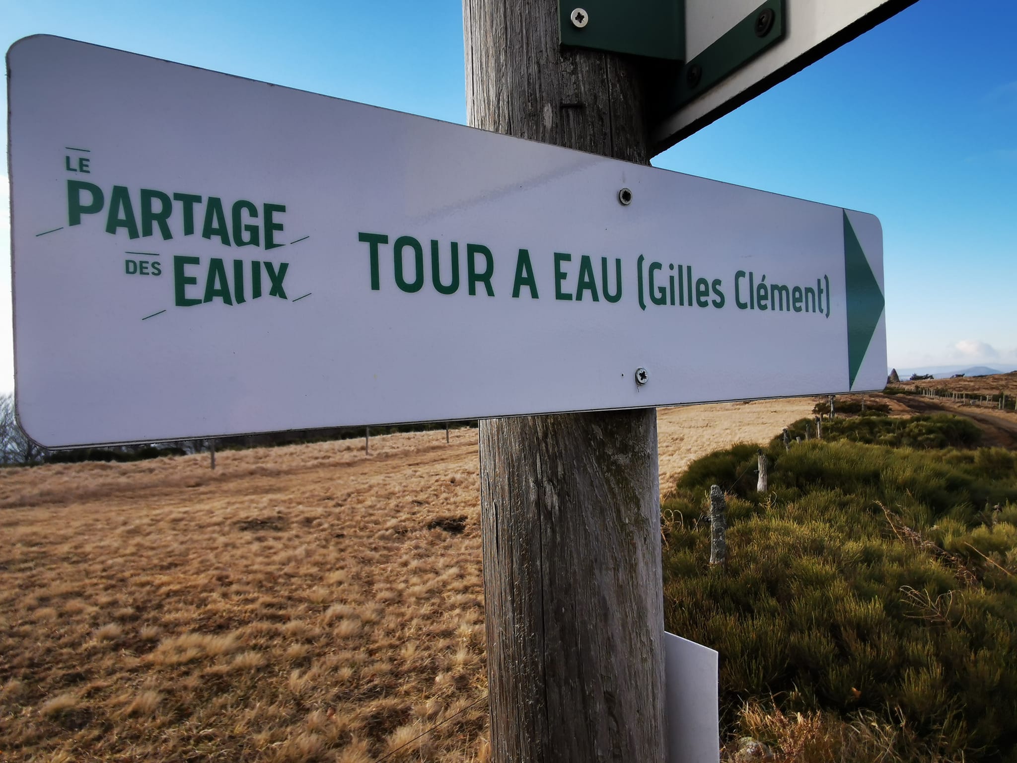 Entre le Mont Gerbier-de-Jonc et Lachamp-Raphaël, au croisement de la D378 en haut du col de Bourlatier, l’entrée de la piste GR420 est matérialisée par un panneau « Ligne de Partage des eaux ».