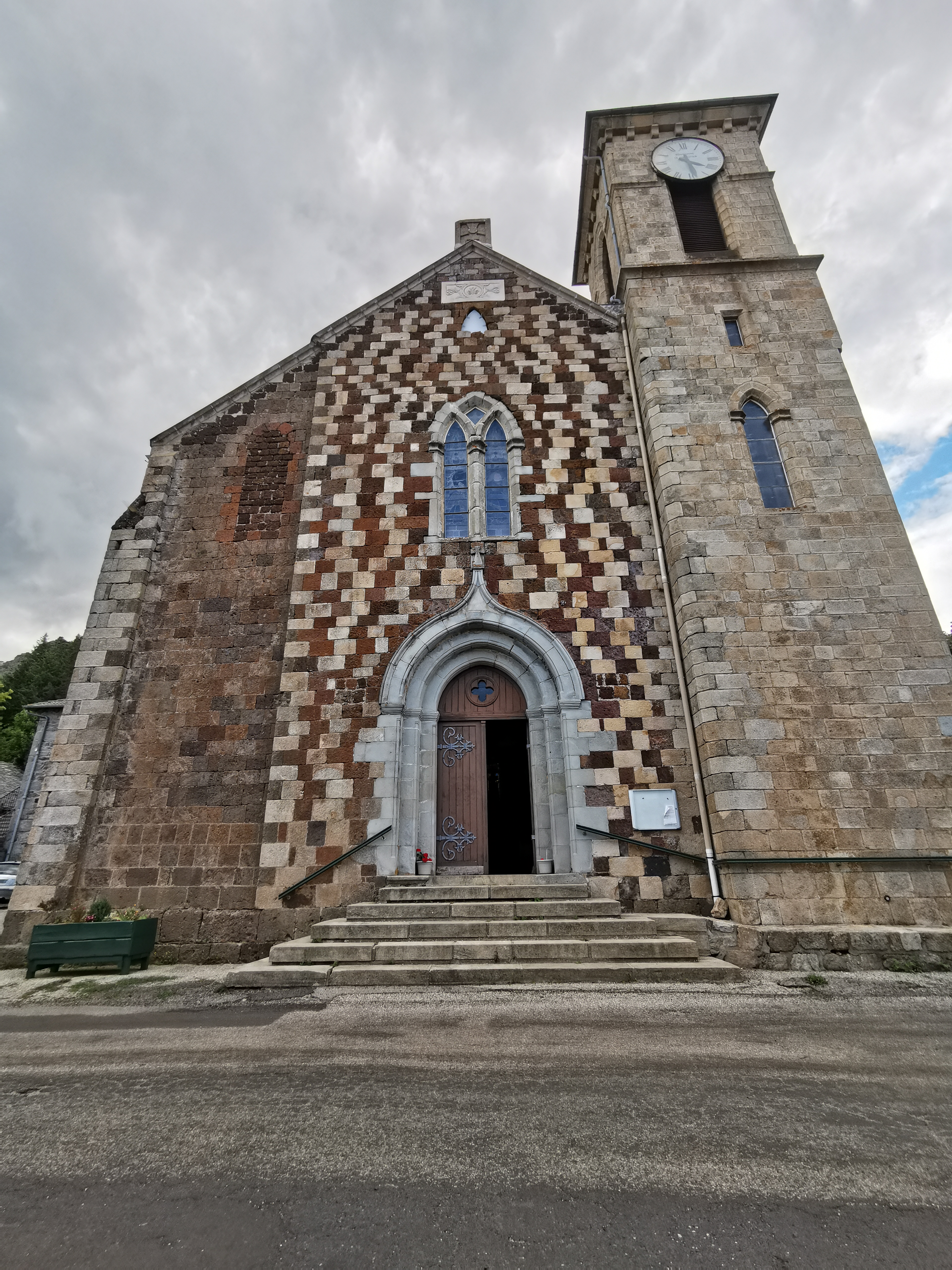 Eglise du XVe, remaniée, reconstruite au XIXe siècle. Architecture à découvrir : damier en roches volcaniques et façade polychrome : tuf jaune, granit, trachyte et scorie rouge. Statue de la Vierge noire du Genestoux, placée au-dessus de l'autel central.