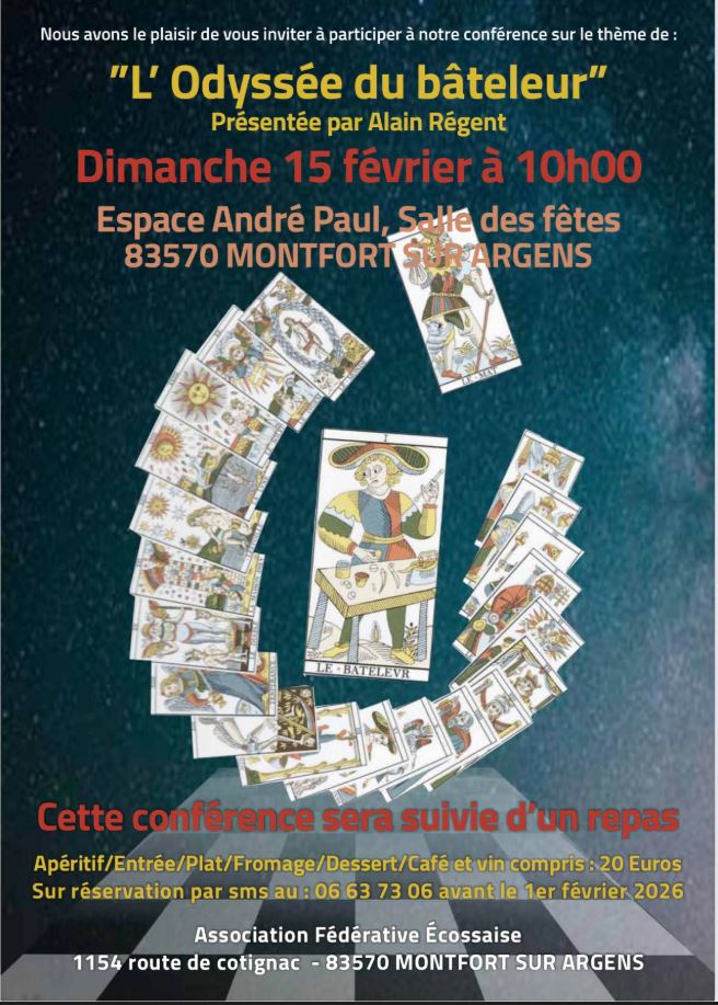 Une conférence présentée par Alain Régent, suivie d'un repas. Au menu : apéritif, entrée, plat, fromage, dessert, café et vin compris.